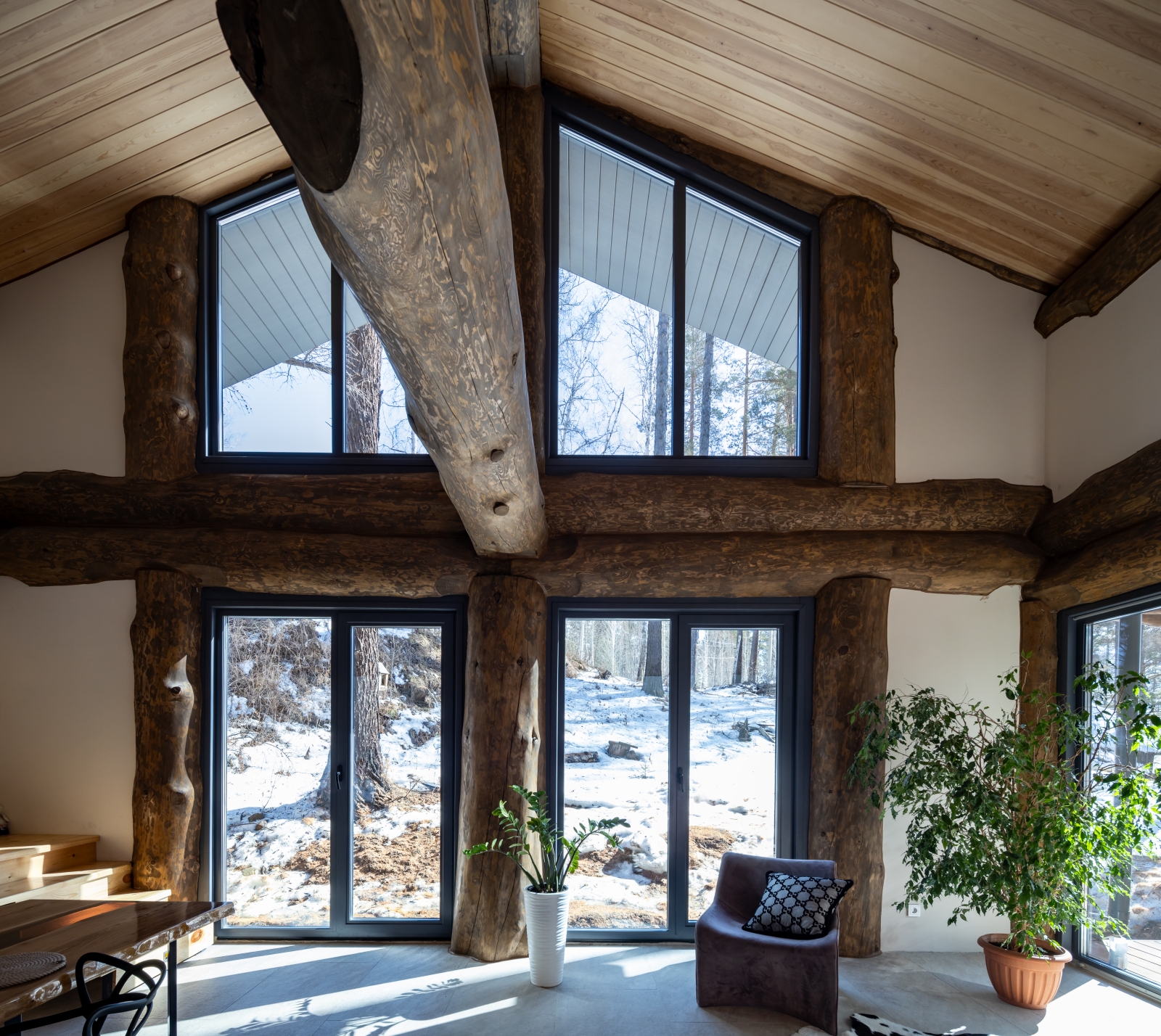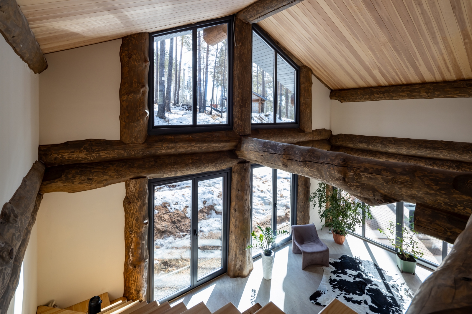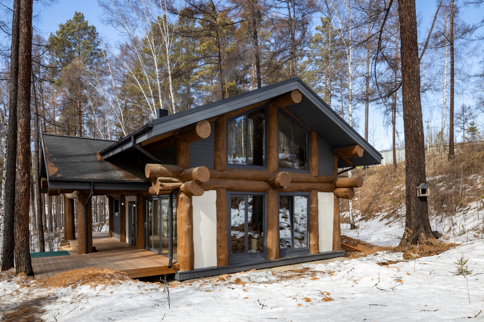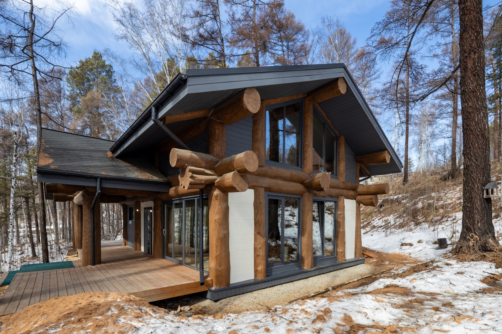 Реализация гостевого дома, который является частью усадьбы с "ТРОГАТЕЛЬНЫМ ДОМОМ С БРУТАЛЬНЫМ ХАРАКТЕРОМ" Технология Post&Beam (стоечно-балочная) из бревна диаметром 50-60 см.