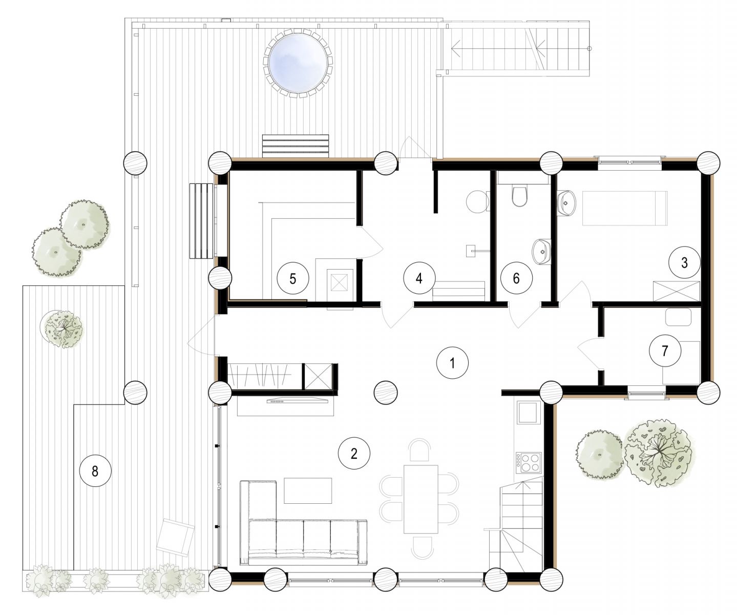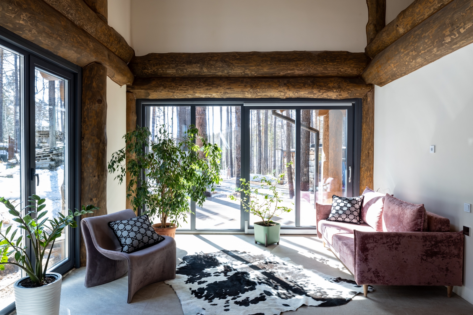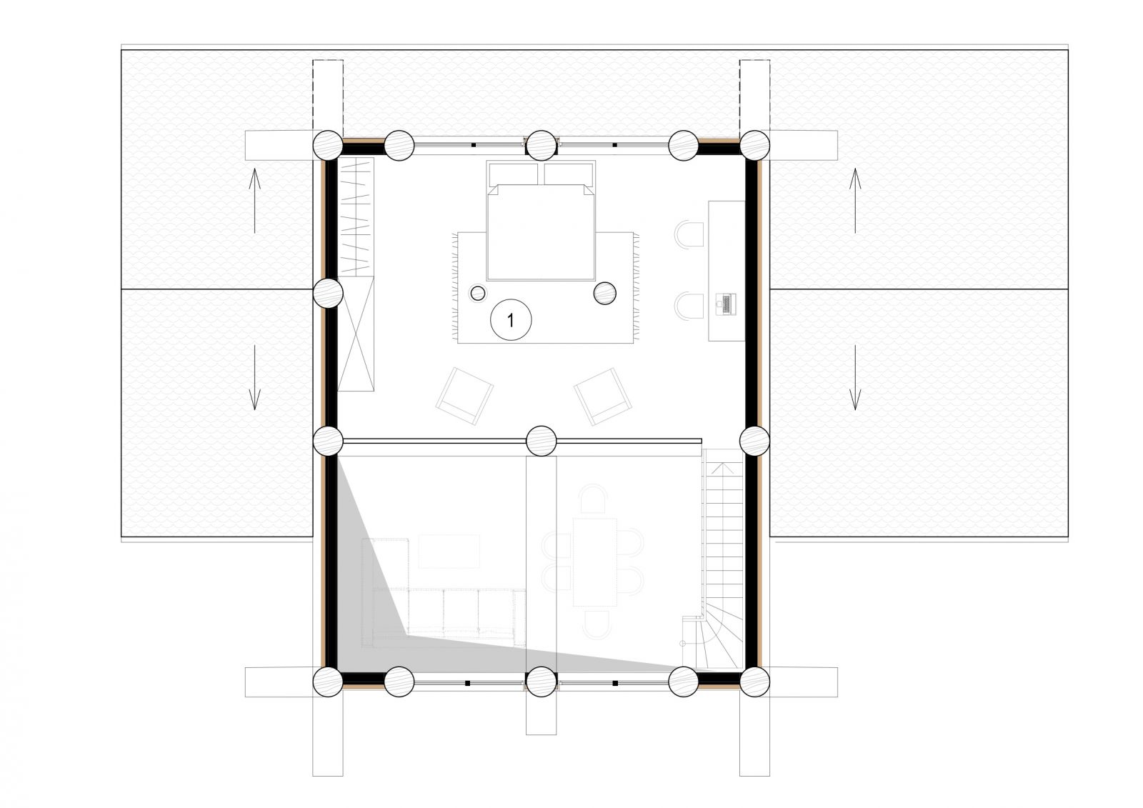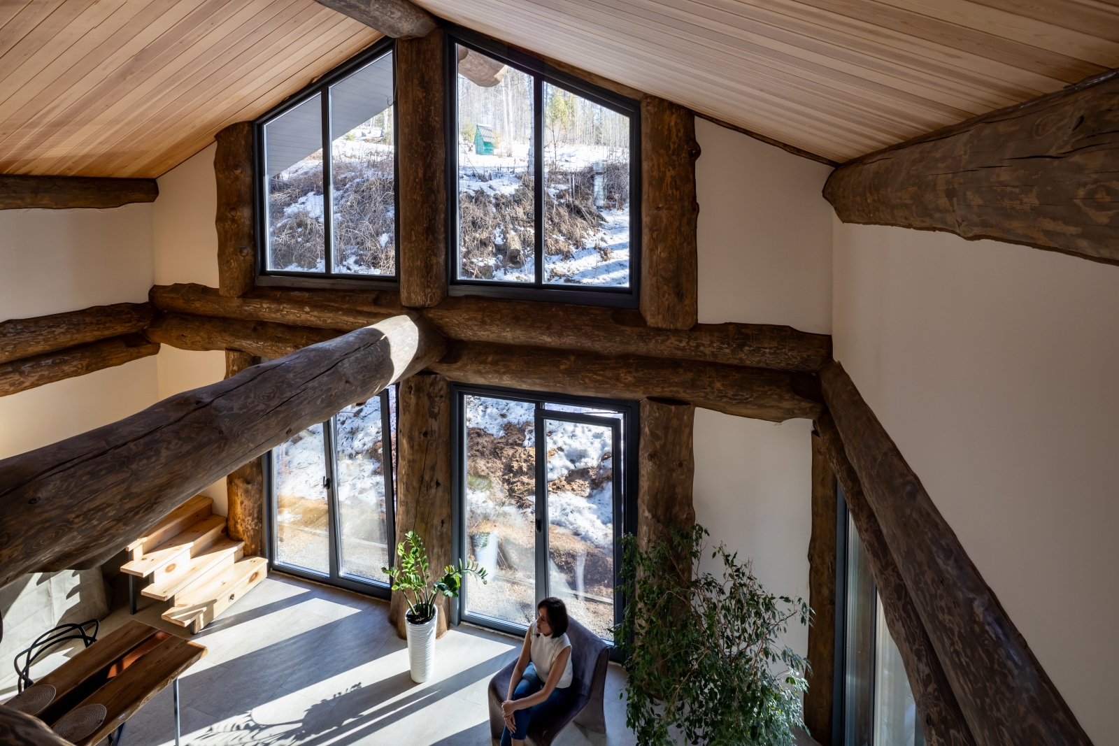Реализация гостевого дома, который является частью усадьбы с "ТРОГАТЕЛЬНЫМ ДОМОМ С БРУТАЛЬНЫМ ХАРАКТЕРОМ" Технология Post&Beam (стоечно-балочная) из бревна диаметром 50-60 см.